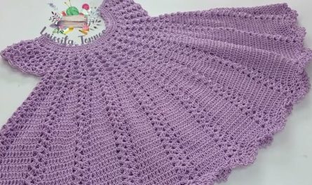 The pattern is worked from the top down, starting with a yoke that’s shaped into a round bodice, followed by a skirt section. It includes a back opening and optional tie closures for easy dressing.