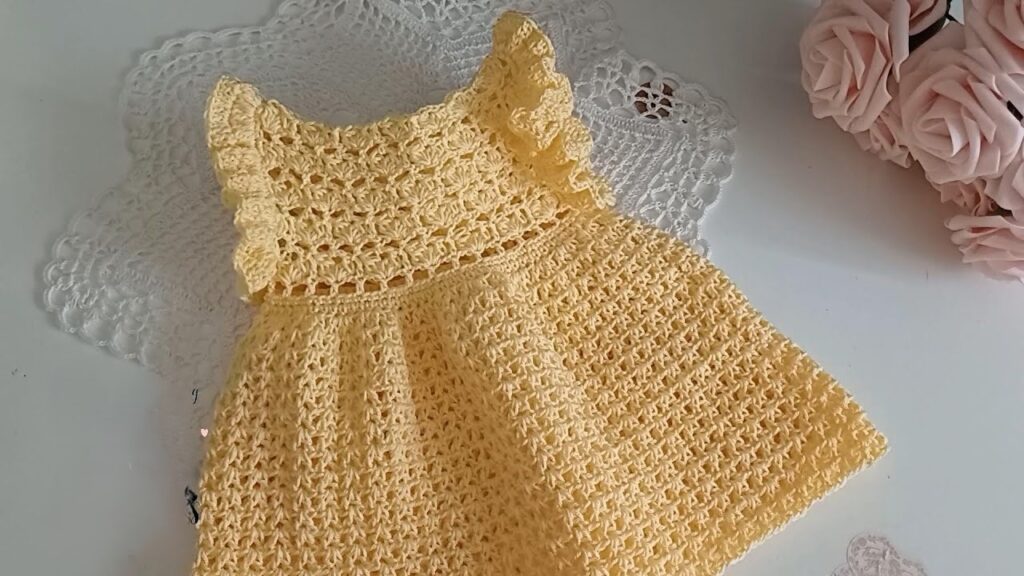 Enjoy crocheting this beautiful and cheerful Sunny Petal Baby Dress! It’s a wonderful project that results in a cherished handmade item. I can help with that! You’ve uploaded several images, and the one titled “maxresdefault (10).jpg-9ae644fb-3b0f-4ec6-ae05-57f170e78a3d” clearly shows a yellow crochet baby dress with a textured yoke and a full skirt featuring a subtle openwork pattern. It also has small ruffle sleeves.