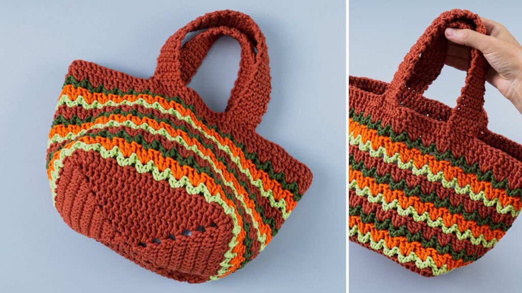 Ready to dive into a project with fantastic texture and a vibrant design? This stunning bag uses a chevron stitch, also known as a ripple or wave stitch, to create its signature pattern. The combination of a solid base and a multi-colored body makes it an eye-catching accessory that’s perfect for any occasion.