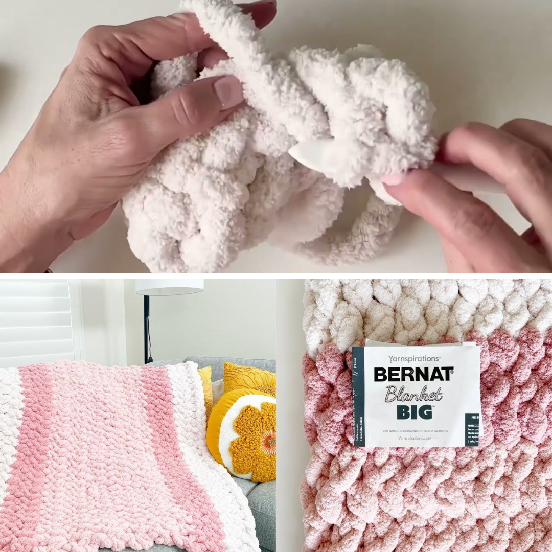 The Bernat Blanket Big Playmat is a thick, ultra-chunky crochet project designed by Tiffany from Daisy Farm Crafts. Created specifically as a soft, padded surface for babies to play on, this mat features a unique “reversible” texture: one side is smooth, while the other side has a decorative braided or ridged appearance.