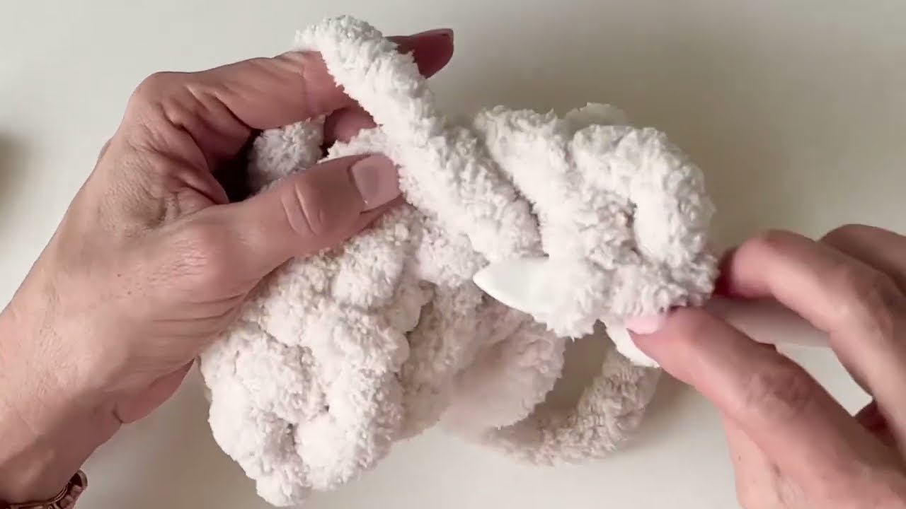 Disguising Tails: Keep twisting and pulling the tail through the loops until it is fully hidden within the chunky texture.